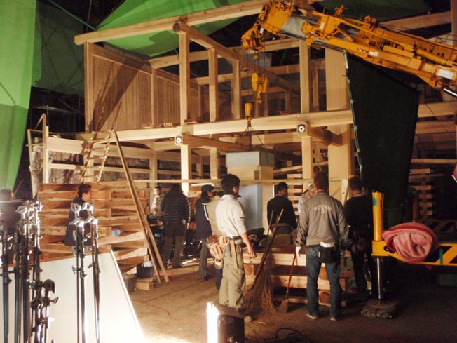 築城に3年、3年後に消滅した幻の城。5層7階建ての撮影には、本物の木組みプラス特撮が必要ですから、建物の裏は、すべてグリーンバックになっています。