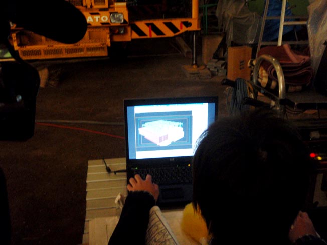 実際には、建物の中は複雑な構造となっているので、人の立つ位置をコンピューーターグラフィック処理をした時に、つじつまが合うように、常にコンピューター上で確認しています。