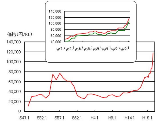 このグラフは、A重油の値段です。。軽油から税金を引いた値段ですね。