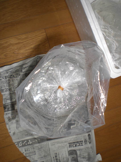 あとは、発泡スチロールの箱に入れ、パッキングします。冬は、カイロを、春には、ペットボトルに熱湯を、夏には氷を、、これは、購入したときの水温を計り、その時の保温方法を習い、考えます。