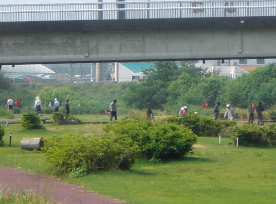 そして先日、快晴の朝、元気よく?河川敷花壇の草むしりに行った。