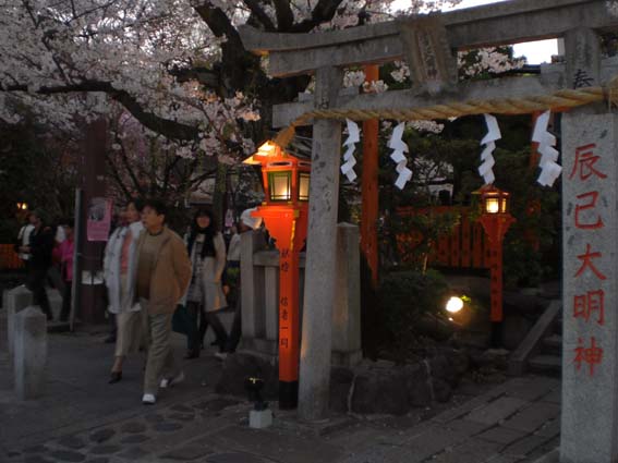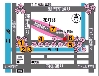 今回、お邪魔するお店は、幹事さんが白川宵桜ライトアップにあわせて、辰巳大明神の目の前のお店を予約してくれていました。四条通りをぶらぶらした後、⑤に向かって北上。