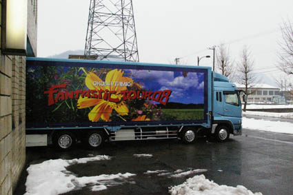 この、大型トラック3台に、機材が満載、、、大雪だったら、、、ぞっとします。さて、ステージつくりですが、おろした機材が多すぎて、置く場所が無い。民生スタッフが、30人近くはいただろうか、、それにコンフォートのスタッフ30人を入れて、舞台の上は朝の9時から戦場になる。まず、足場が組まれる。4段間で積むとほぼ、ステージの間口の高さになる。この足場(イントレ)が、、、なんと9箇所。。。正面左右のイントレには、2千人の会場と同じスピーカーが電動ホイストで、吊り上げられる。。正面後ろに設置されるイントレ最上部には、それぞれ、一つ照明が付くのですが、、この照明が凄い。。この照明は、一台が数百万するのですが、この照明が全部で10台近くはあったかな?テンコーのときは2台しか有りませんでした。。。