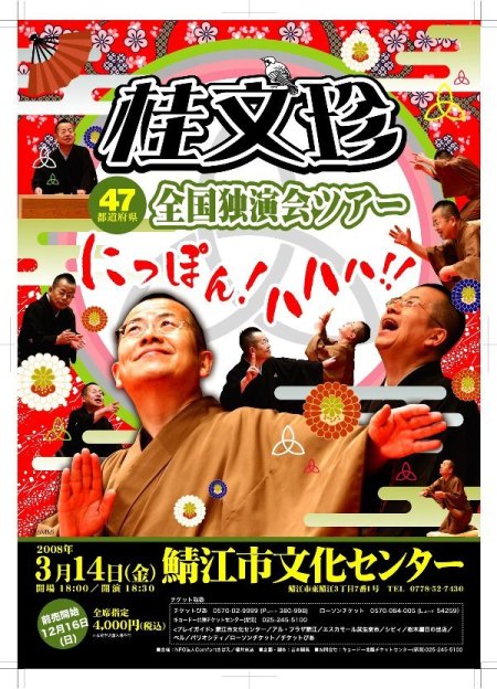 落語は2年前の、春風亭小朝、以来ですが、NHKのドラマ人気もあってか人気があるようです。文珍さんのほうが、親しみが沸くのかも知れないですね。