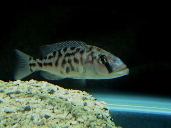 ティラノクロミスは、恐竜でいうところのティラノザウルスで、ティラノとは暴君の意味です。アフリカ マラウイ湖の暴れん坊ということになりますが、実体以上に、その凶暴な顔と、魚食性によるところが大きいです。約2年ぶりに、このティラノクロミス ニグリベンターで、マラウイに戻ってきました。久しぶりのティラノは懐かしさと共に、やっぱりクールです。体長は13cmと、まだまだ若魚ですが、ワイルドもこのサイズから育てるほうが楽しいです。パターンがちょっと珍しいと思うのは、気のせいかな?