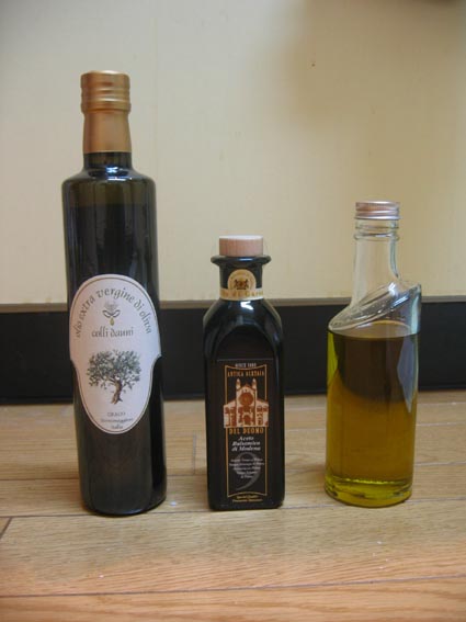 中央、この写真だと右側、9年物のバルサミコ(Balsamico)とはイタリア語で「芳香がある」という意味で、色は茶色を濃くした黒色で、その名の通り独特の芳香が有りますが、このクラスでさえ、小指に着けた程度でも、口の中にずっと香りが残ります。おいしいですよね~ぶどうを樽で熟成するのですが、伝統的なバルサミコ酢は最低12年の熟成や原料のブドウの種類が法律で義務づけられていてモデナ産が特に有名。。モデナって言われると、、跳ね馬を想像しちゃいますね(笑)
