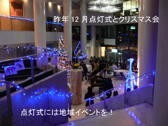 全国各地で冬の名物となっている、イルミネーションですが、駅東(駅裏)から文化センター付近、までは、意外と暗く不安になる時もあります。事業をしていても、この辺暗いね。と言う声を聞く。文化センターという箱物は、地域との人的接点が少ない。コミュニケーション(自治会)などに、ほとんど参加していない。では、なにかアプローチしてみたい。。