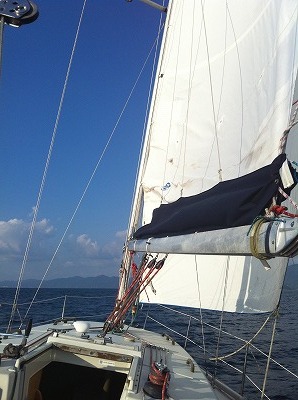 ところが、船はヨットだ。。海に出ると、帆を張り出した。。