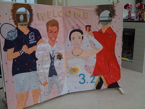 新郎新婦入場の前に、なれ初めビデオが、、ロールプレーイングゲーム風に流れる。。